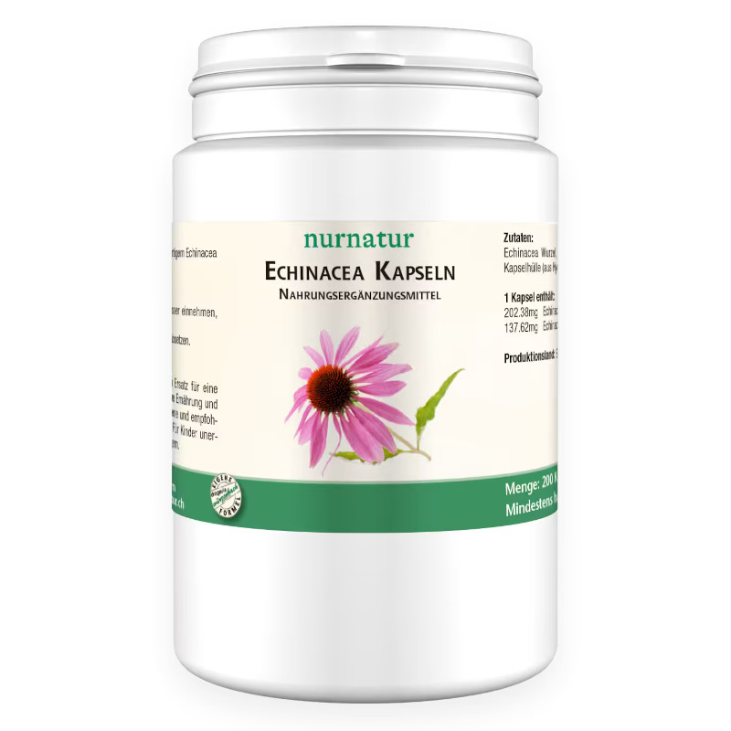 1 Kapsel enthält: 202.38mg Echinacea purpurea Wurzel Pulver, 137.62 mg Echinacea purpurea Kraut Pulver. Vegetabile Kapselhülle (aus Hydroxypropylmethylcellulose).